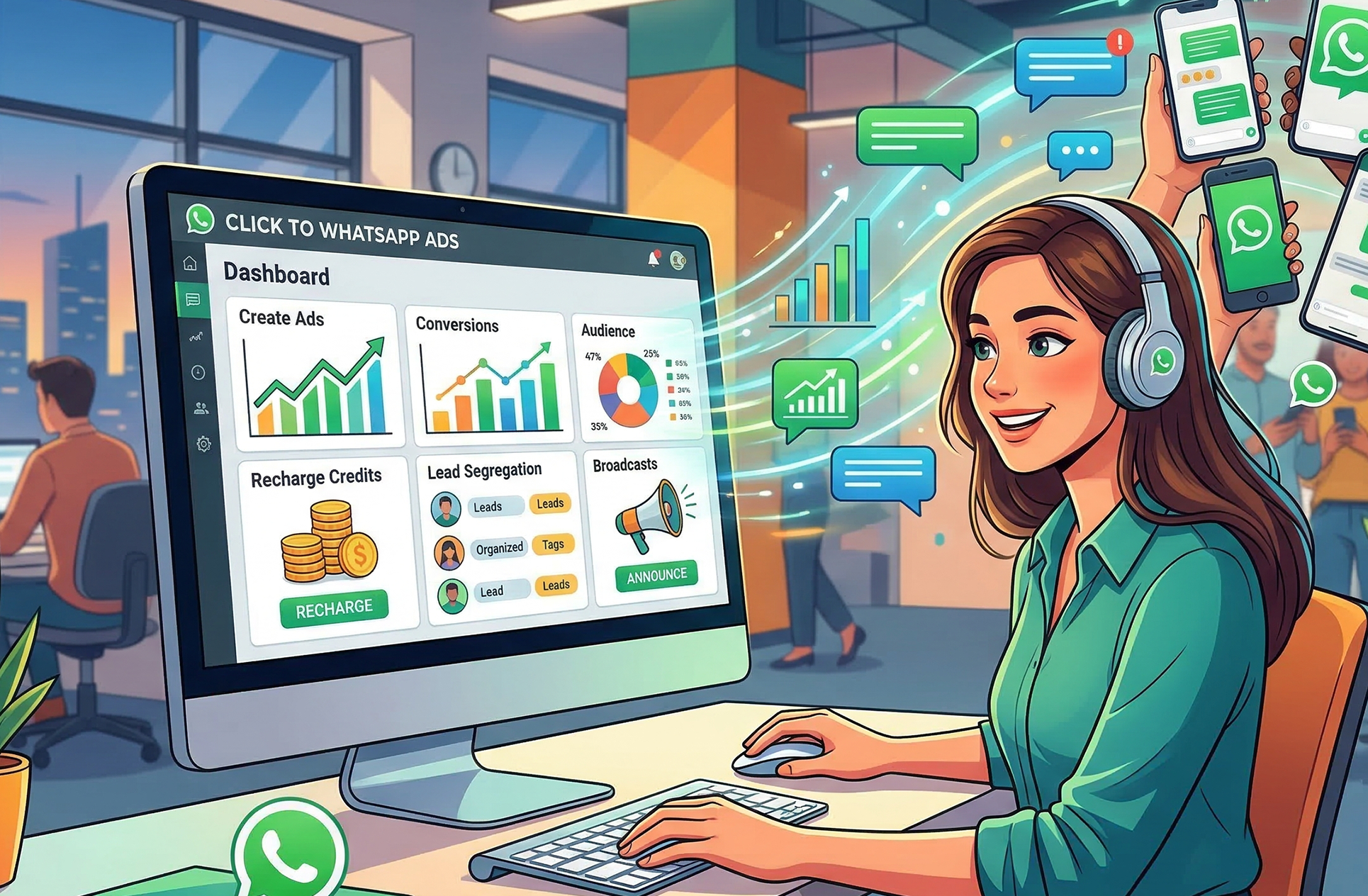 Recharge ad credits, Create & run ads, segregate leads, re-engage with Broadcasts & drive conversions.